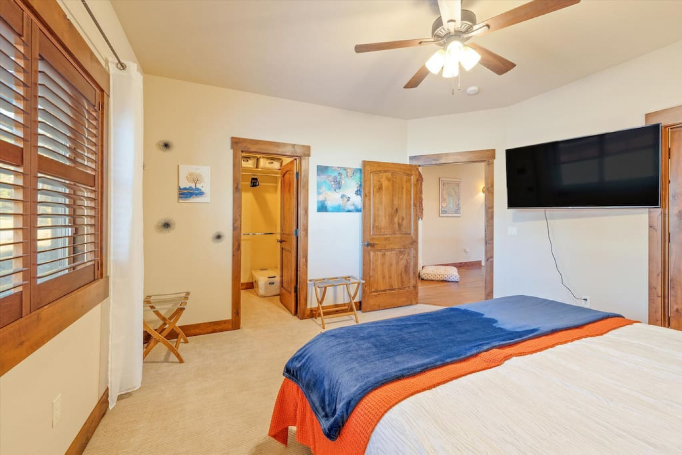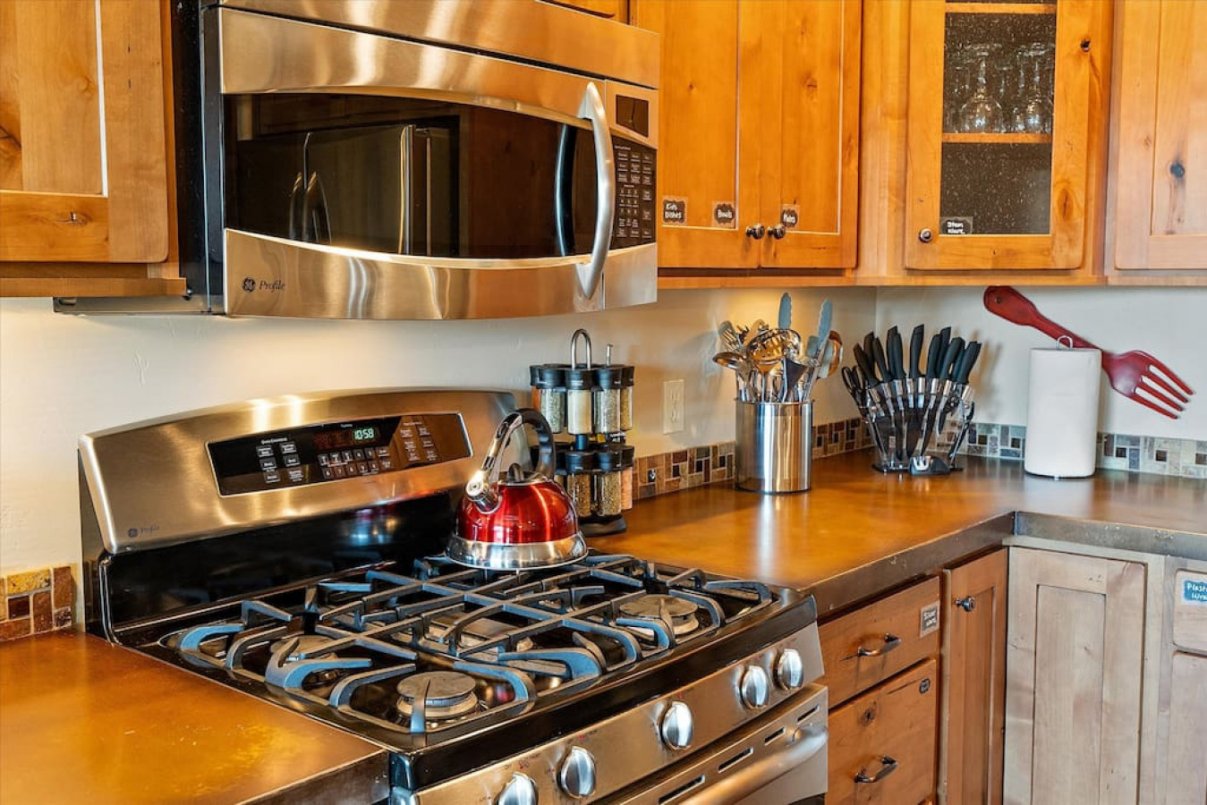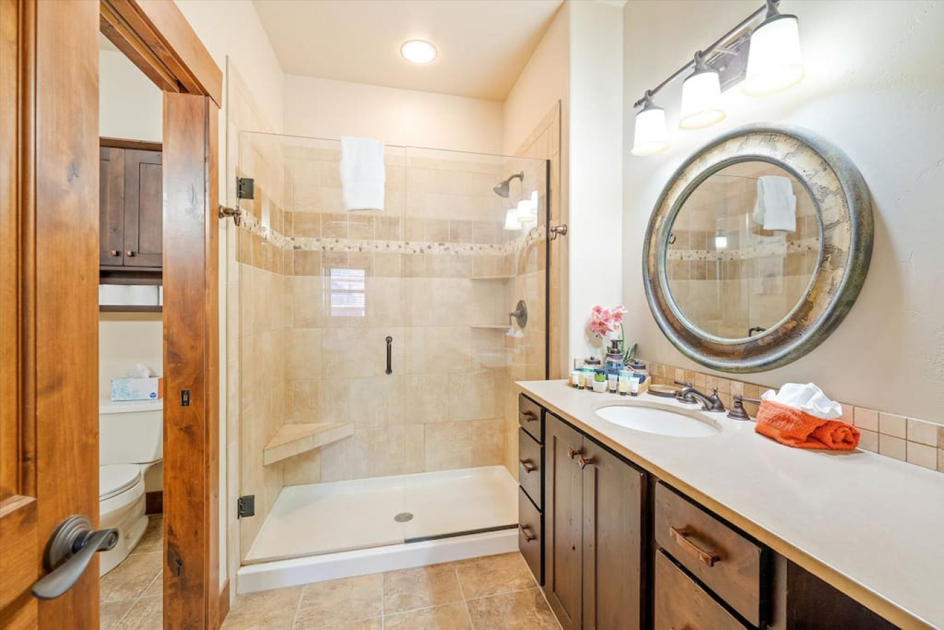 Inside, a warm and inviting living space welcomes you. The open-concept layout seamlessly connects the living, dining, and kitchen areas. Sink into plush sofas, watch your favorite shows on the flat-screen TV, or simply relax and enjoy mountain views through the large windows.
