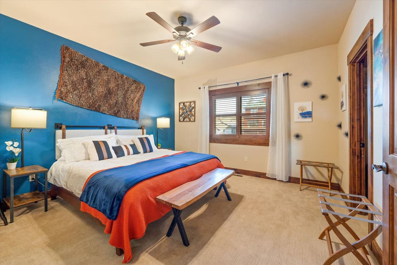 Two comfortable bedrooms await, each thoughtfully furnished for a restful night's sleep. The master bedroom features a cozy king-size bed, while the second bedroom offers a bunk arrangement with two full beds and an upper twin, and the living room has a sleeper sofa, ideal for families or friends. With soft linens and tasteful decor, you'll feel right at home.