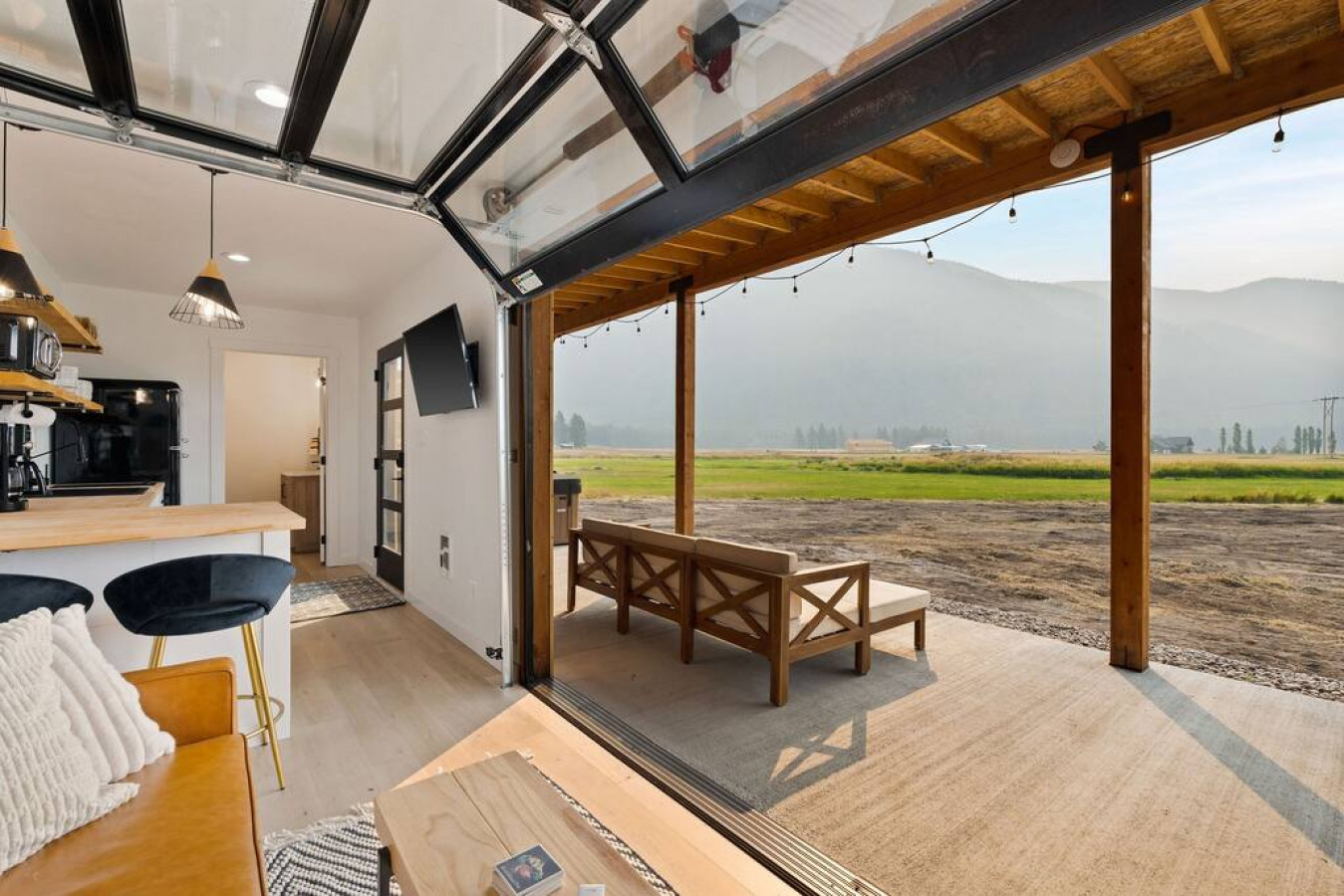In the living room you will find a grand glass garage door to open the space into the outdoor seating and dining area (outdoor couch not available in winter). The true feeling of indoor/outdoor living. The couch is capable of proving lounging space or additional sleeping space.
