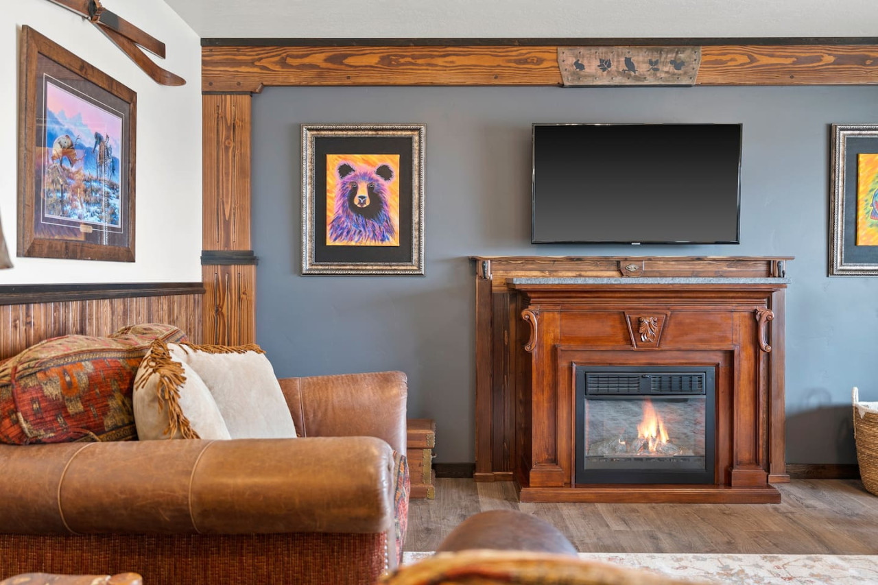 Approaching this cabin, you can't help but feel its genuine rustic charm, crafted with care and a touch of artistry. The warm tones of natural wood seamlessly blend with the landscape, creating a timeless connection to the surroundings. Inside, sunlight floods through expansive windows, offering stunning views of the pond and mountains.