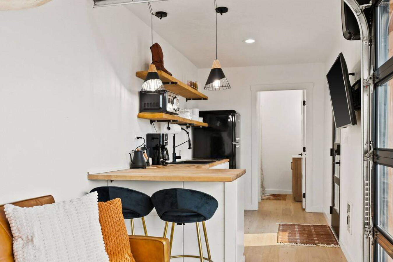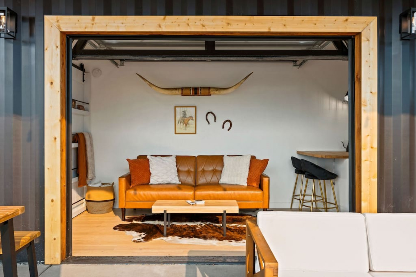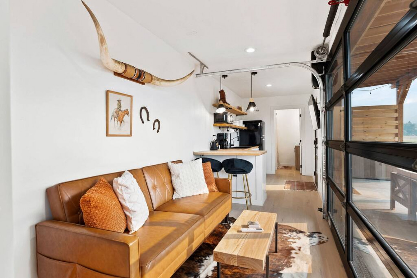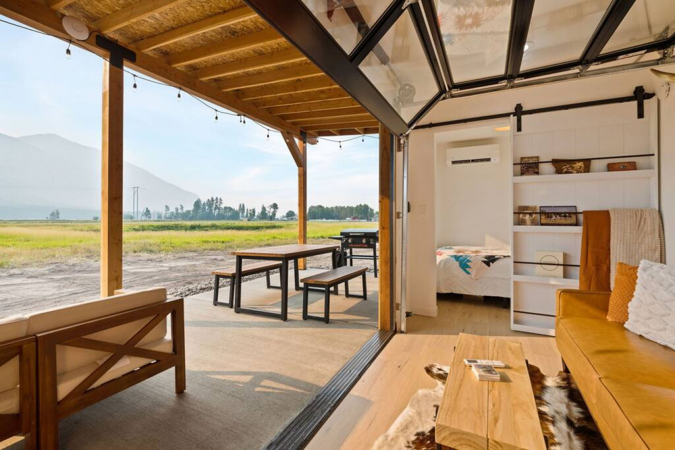 In the living room you will find a grand glass garage door to open the space into the outdoor seating and dining area (outdoor couch only available in summer/fall). The true feeling of indoor/outdoor living. The couch is capable of proving lounging space or additional sleeping space.