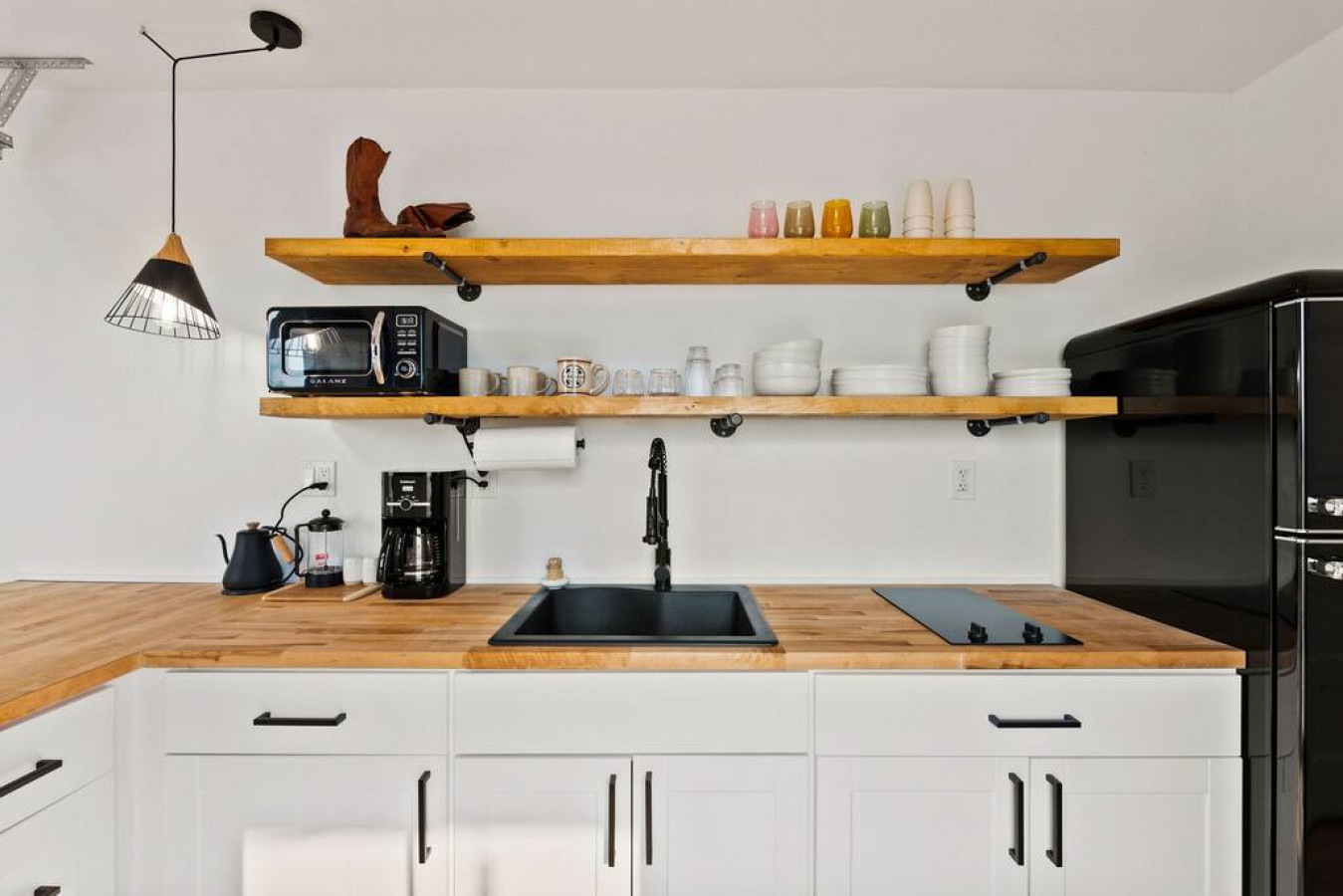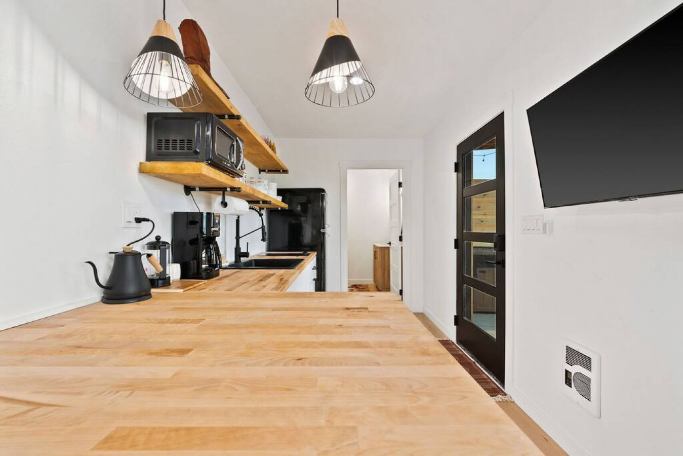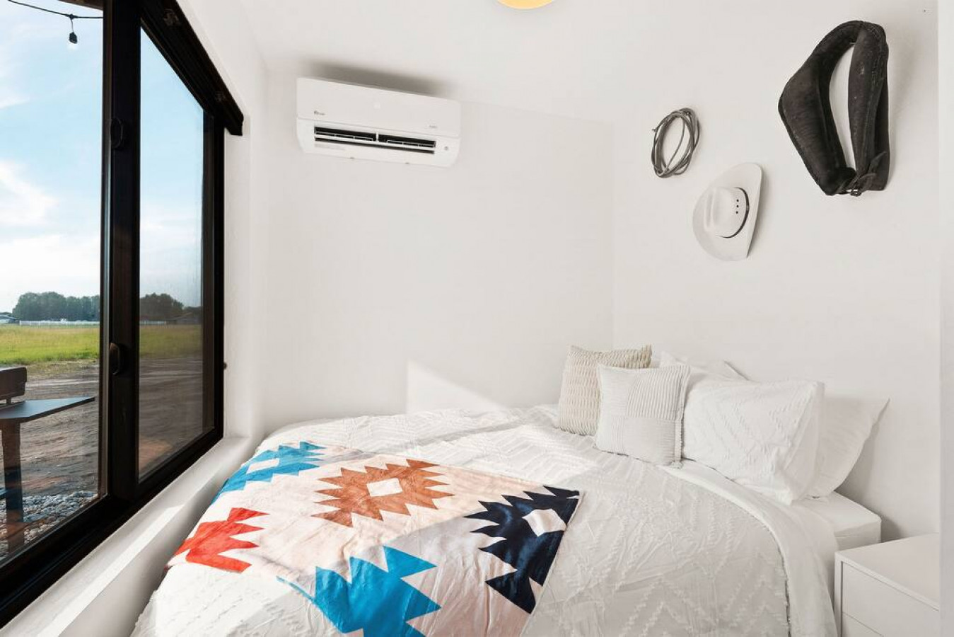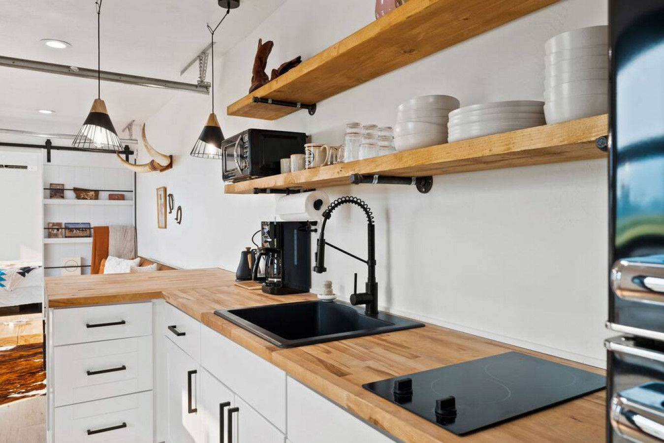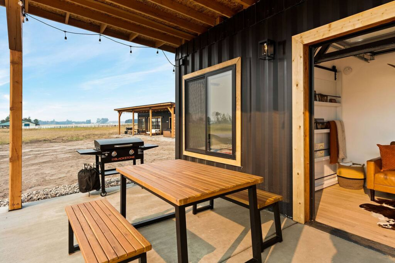 In the living room you will find a grand glass garage door to open the space into the outdoor seating and dining area (outdoor couch only available in summer/fall). The true feeling of indoor/outdoor living. The couch is capable of proving lounging space or additional sleeping space.
