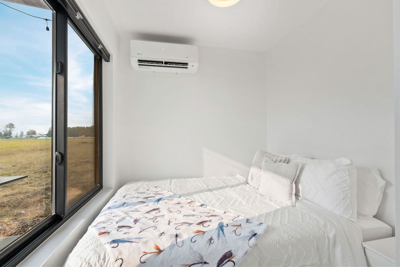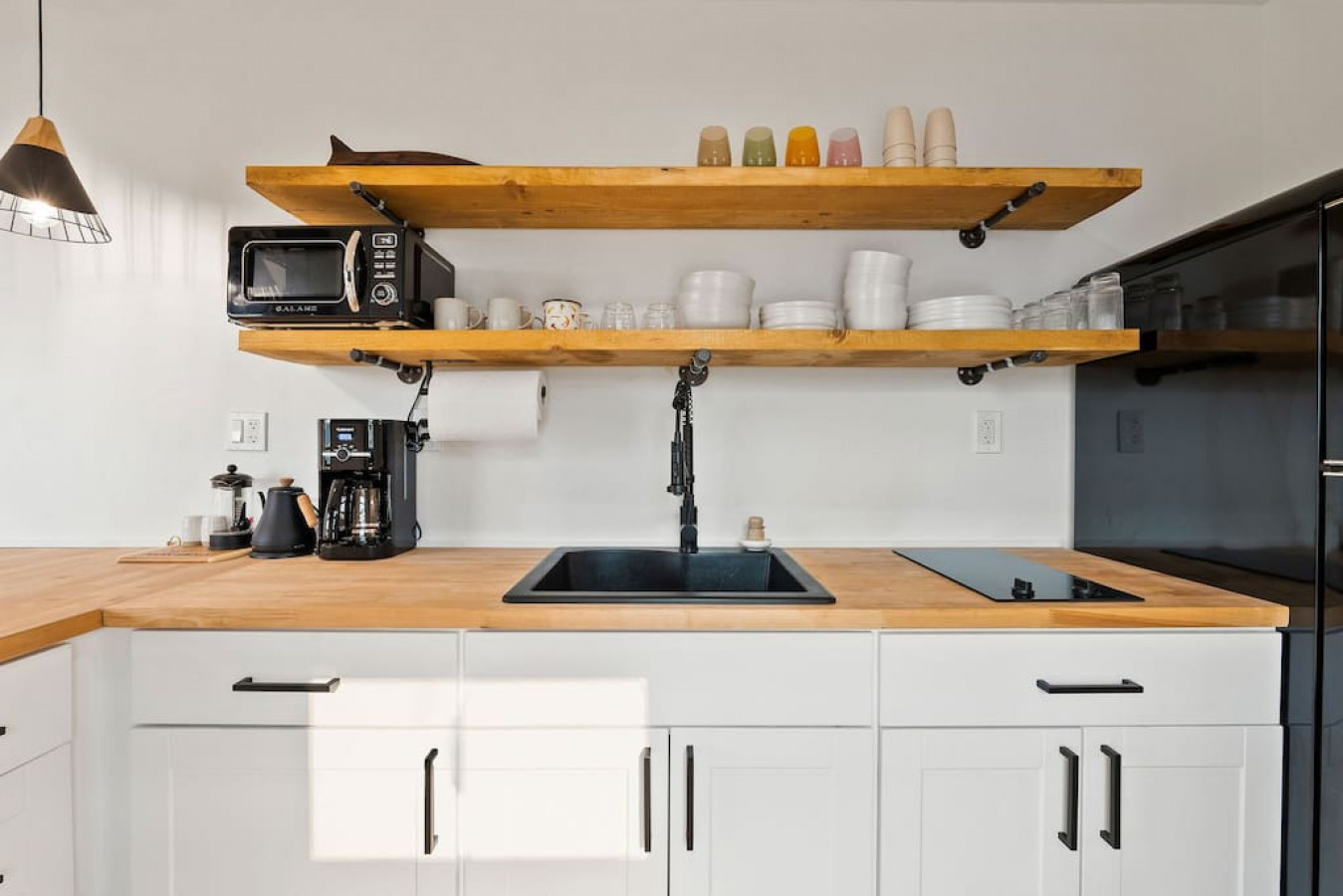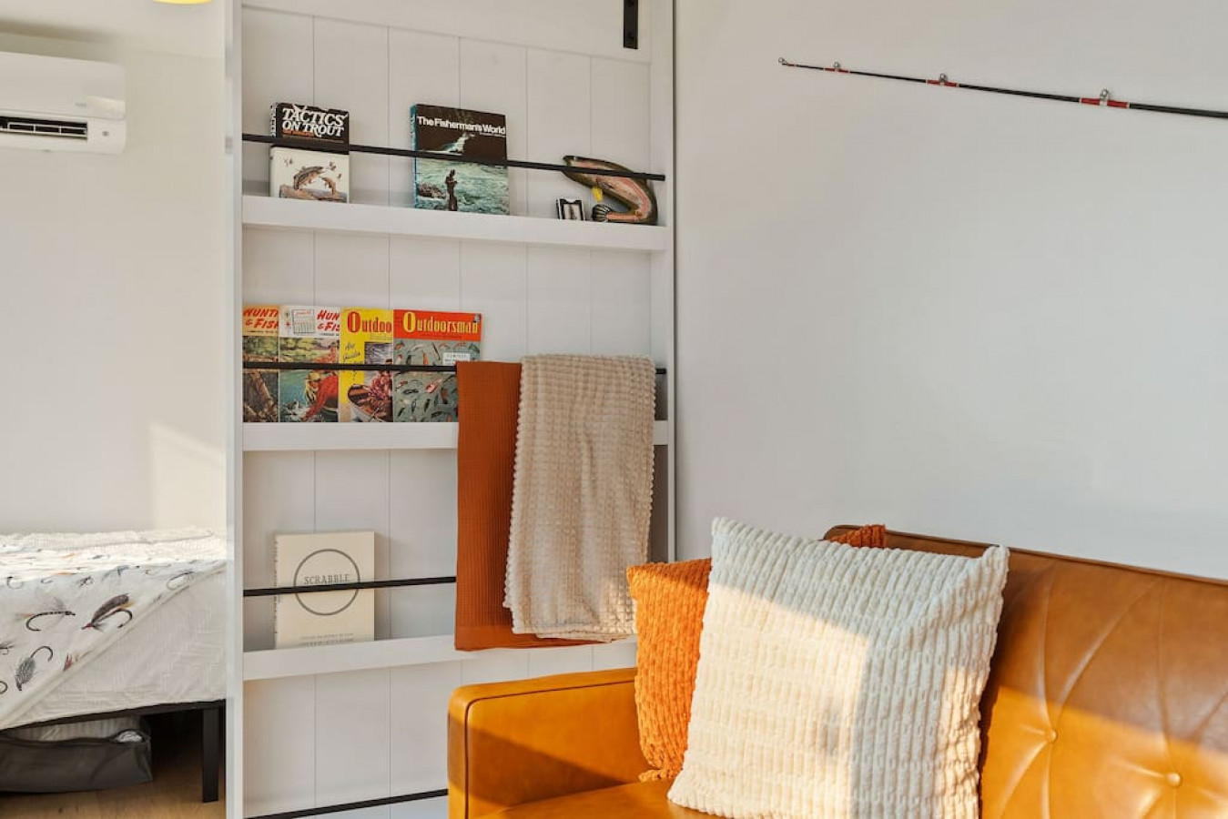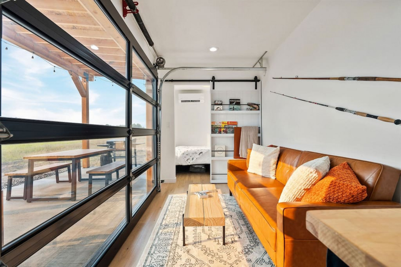 In the living room you will find a grand glass garage door to open the space into the outdoor seating and dining area (outdoor couch not available in winter). The true feeling of indoor/outdoor living. The couch is capable of proving lounging space or additional sleeping space.