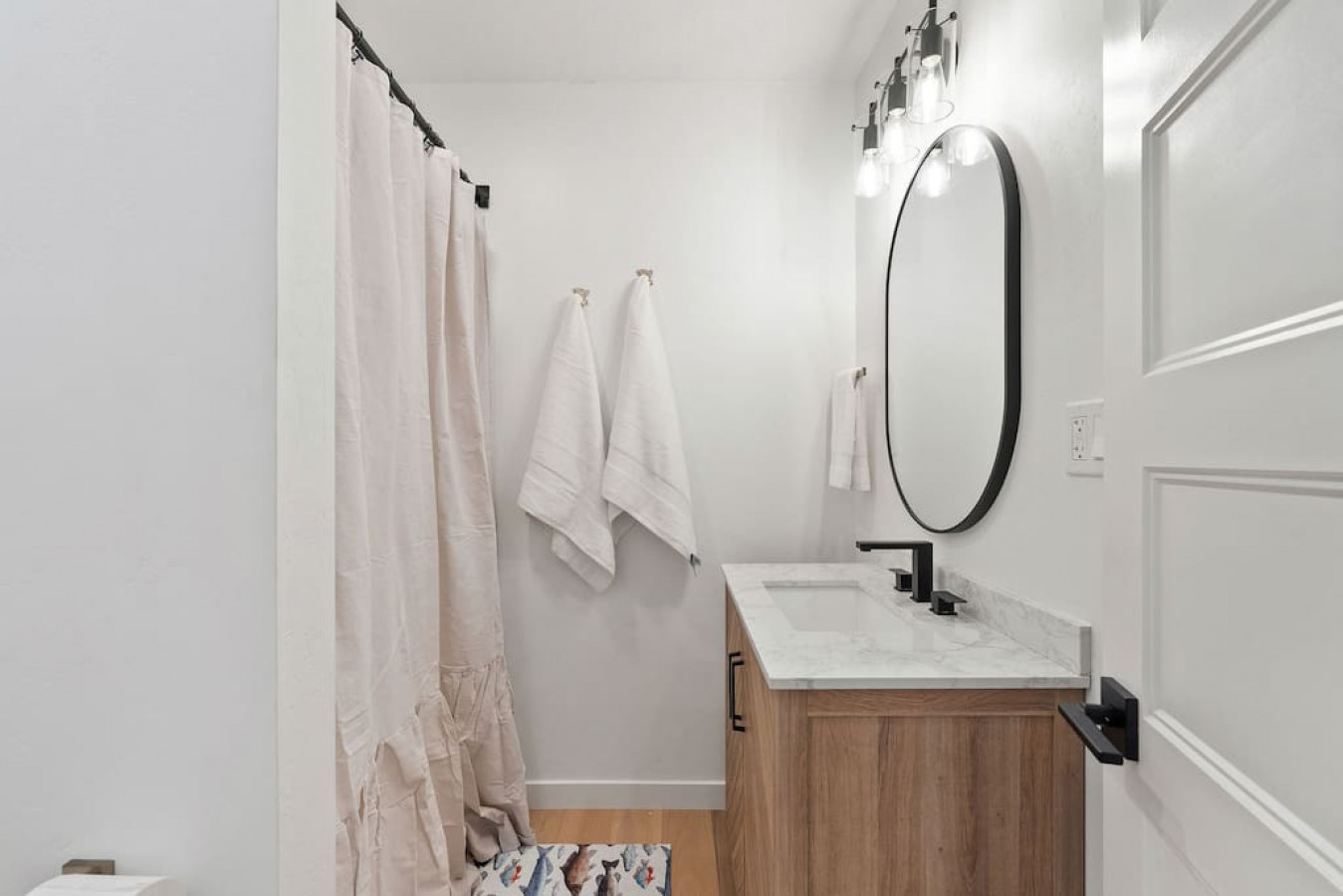 Inside you will find a charming bathroom with a walk in shower and spacious vanity. The kitchen is stocked with the cooking utensils and applianced to make delightful meals or prepare snacks for your adventures ahead. The bar seating is great for conversations over coffee and breakfast.