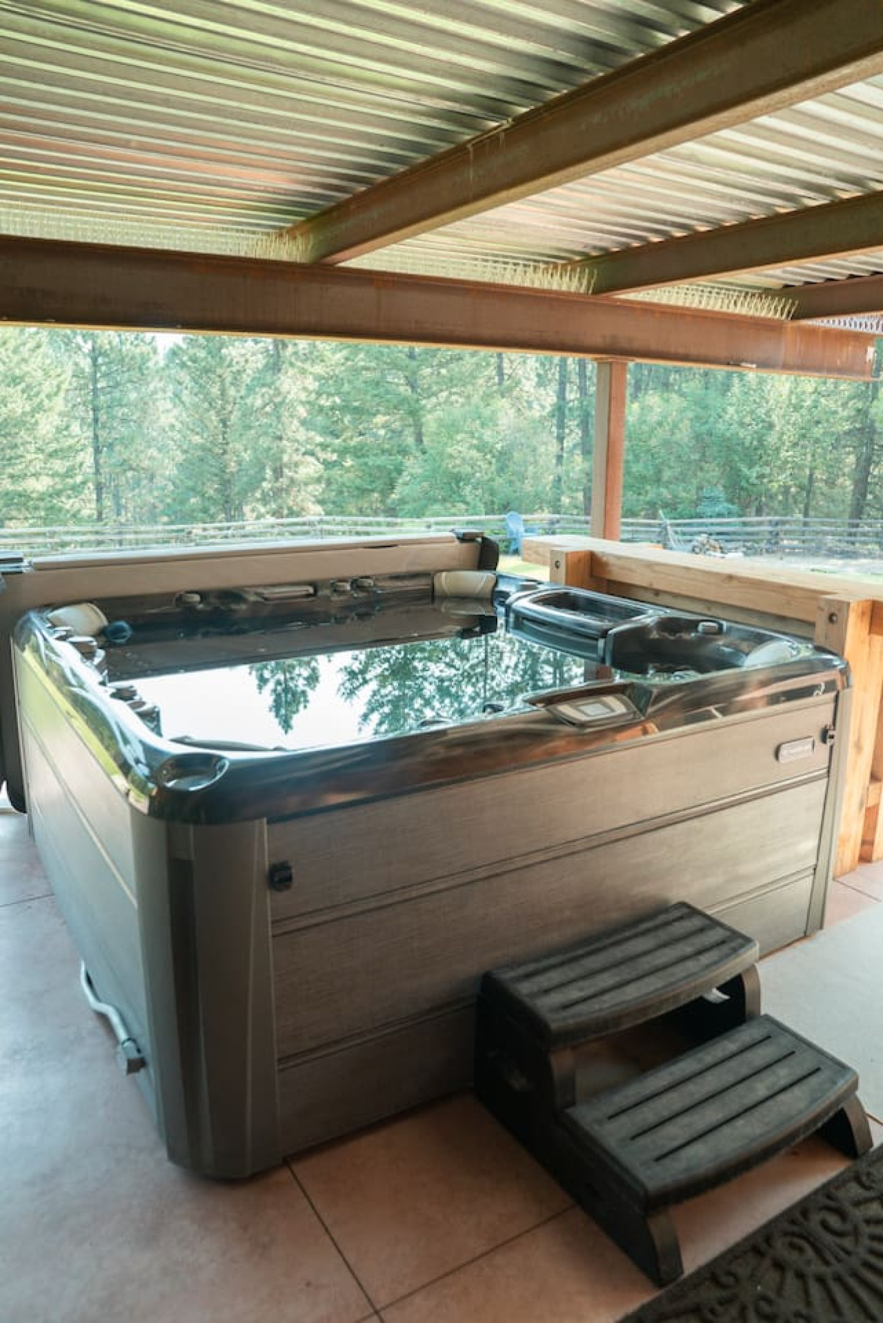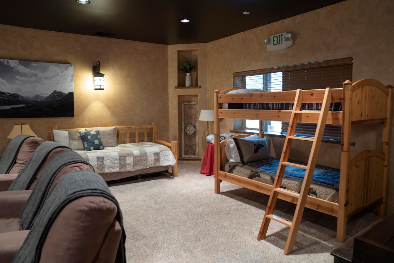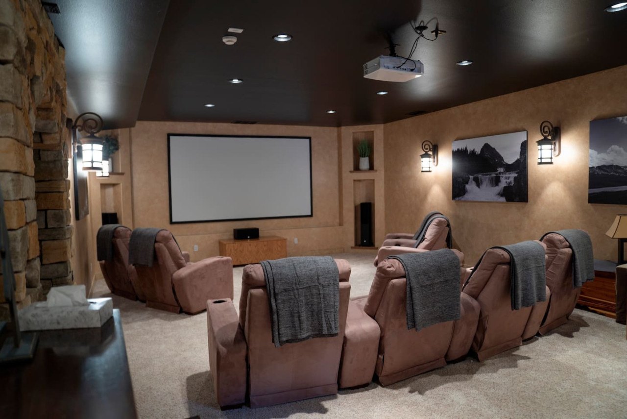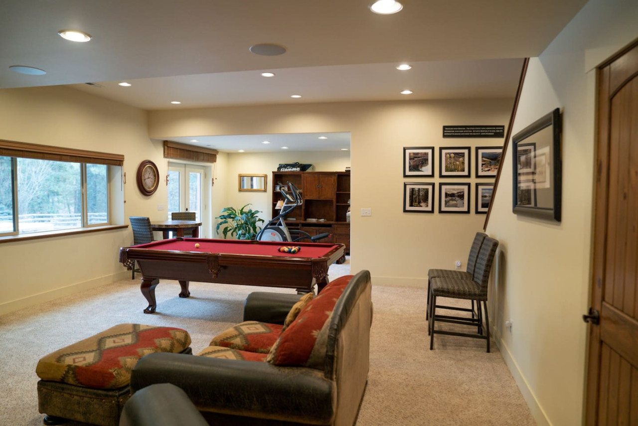 Downstairs you will find a the hot tub outside, ping pong table outside, pool table, and theatre room. This open space is great for the whole group.