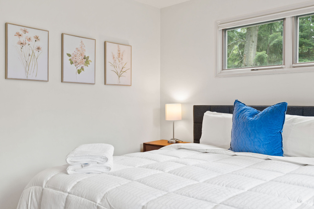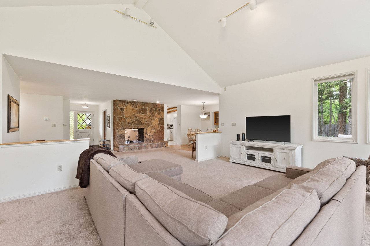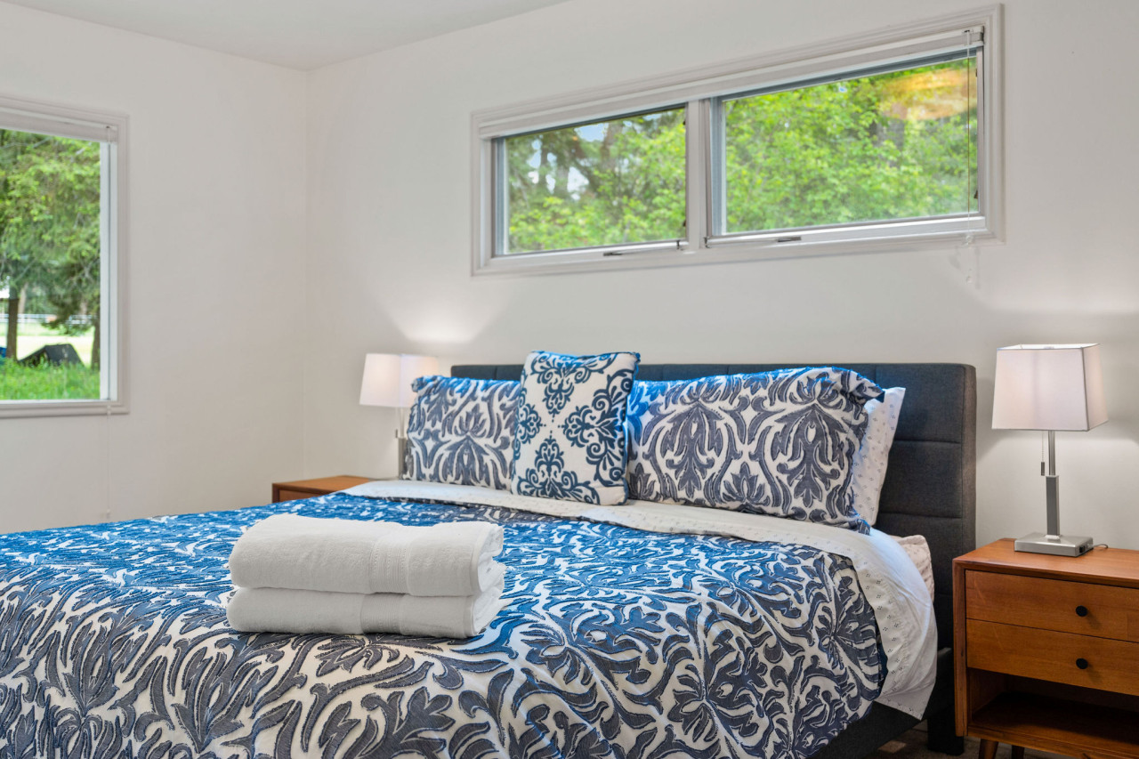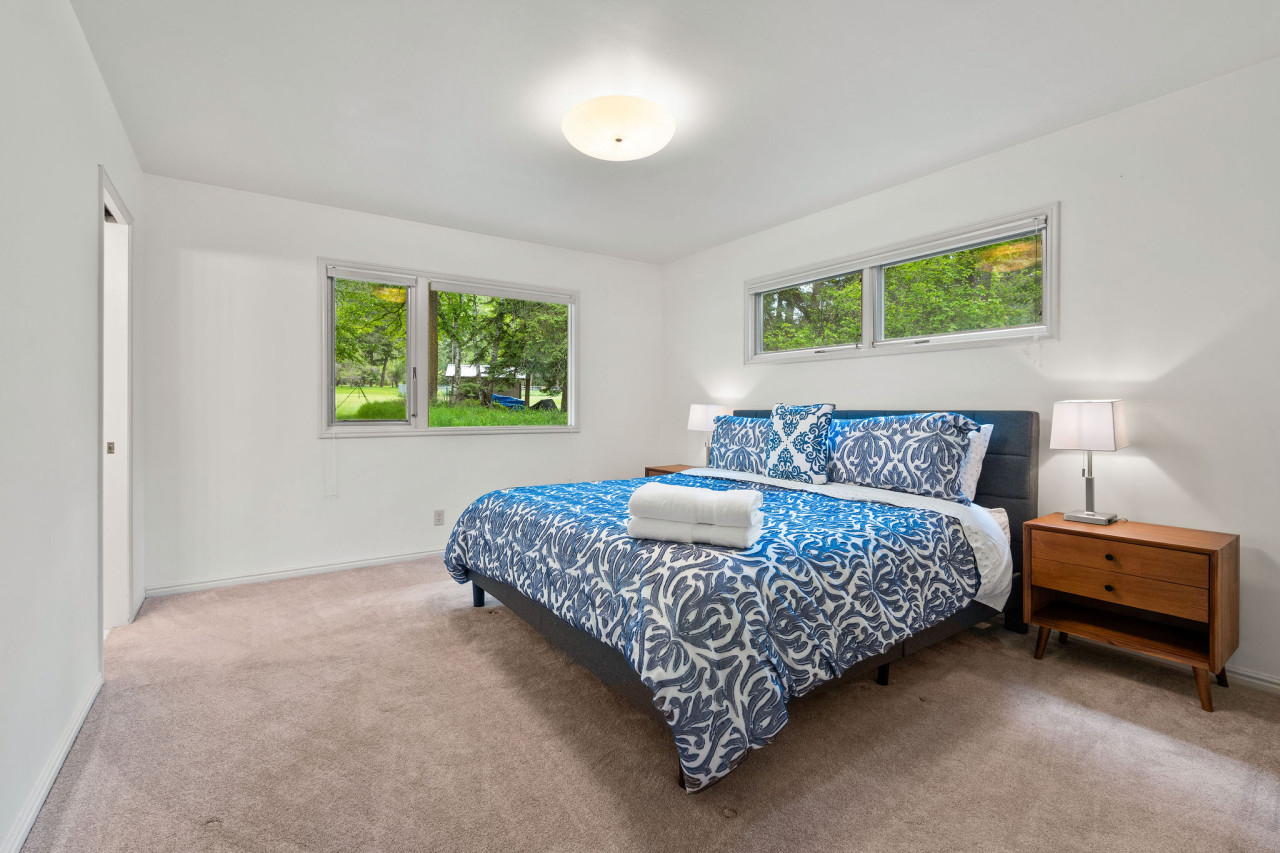 Covered parking is provided along with additional driveway parking. There is a nice sized front yard that faces the road and looks towards Lake Blaine. The back yard gazes up at the mountain tops and is secluded by surrounding trees. There is a level ground trampoline that is fun and safe for all ages. You will find four bedrooms in this one story home that comfortably sleep 10 guests. Three king beds in the main bedrooms and two queens in the additional sleeping room. The main living area has a comfortable sectional with a TV. The large windows show the spectacular view of Blaine Mountain.